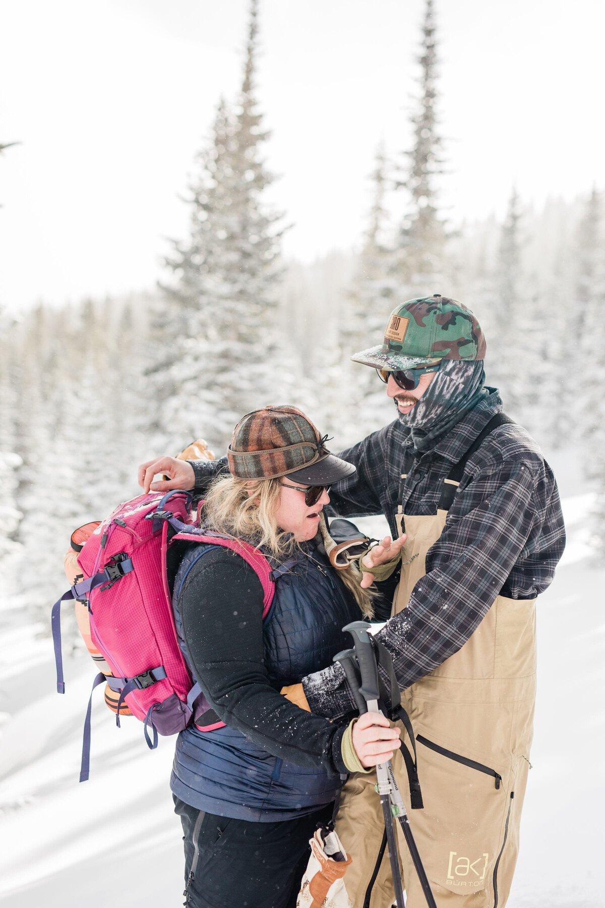 This was such a fun session! We kicked off the day with some backcountry touring, but little did Kelley know, Scott and I had packed a little something extra; champagne and a ring!